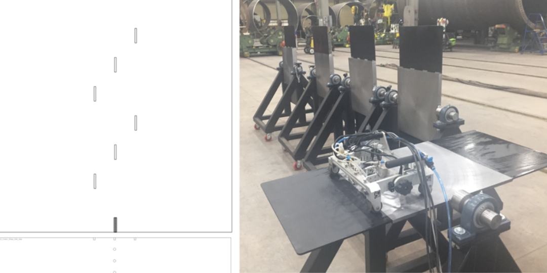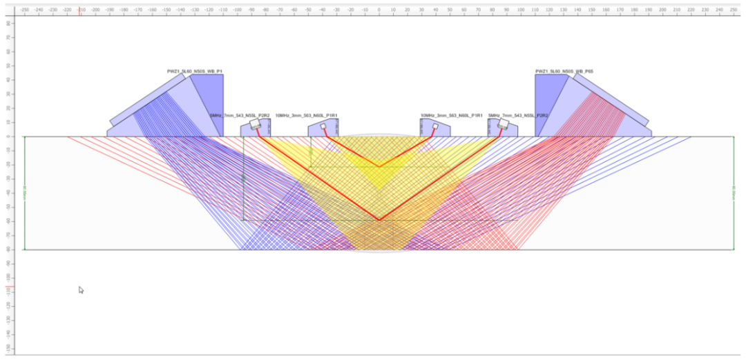 通過聲學仿真模擬研究出適合風電塔筒焊縫的探傷工藝,工藝采用2個PA探頭和4個tofd探頭,在焊縫兩側對稱分布,實現對焊縫的全覆蓋檢測。