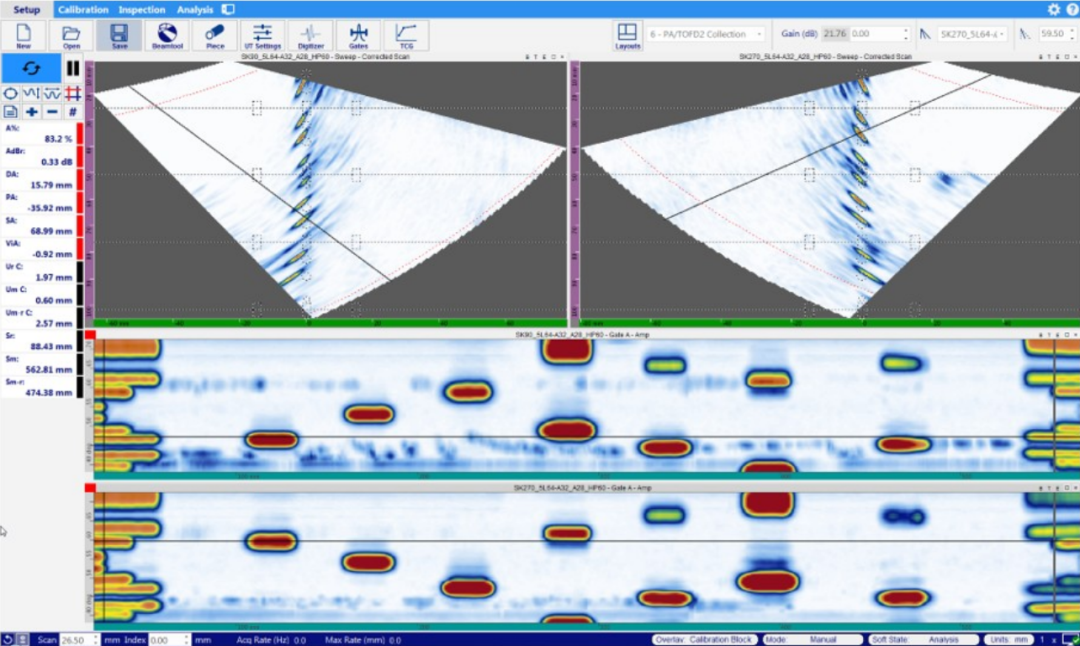 如上圖所示,可以實現對試塊中各種模擬缺陷的檢出并確定缺陷位置、長度及大小等信息。